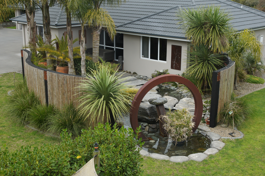 “Floating” stepping stones, a sculptural waterfall, corten steel “moongate”, “fortress” doors and curved timber, bamboo panel walls and extensive pond created a protective sanctum and soothing reflective ambiance reminiscent of another world.